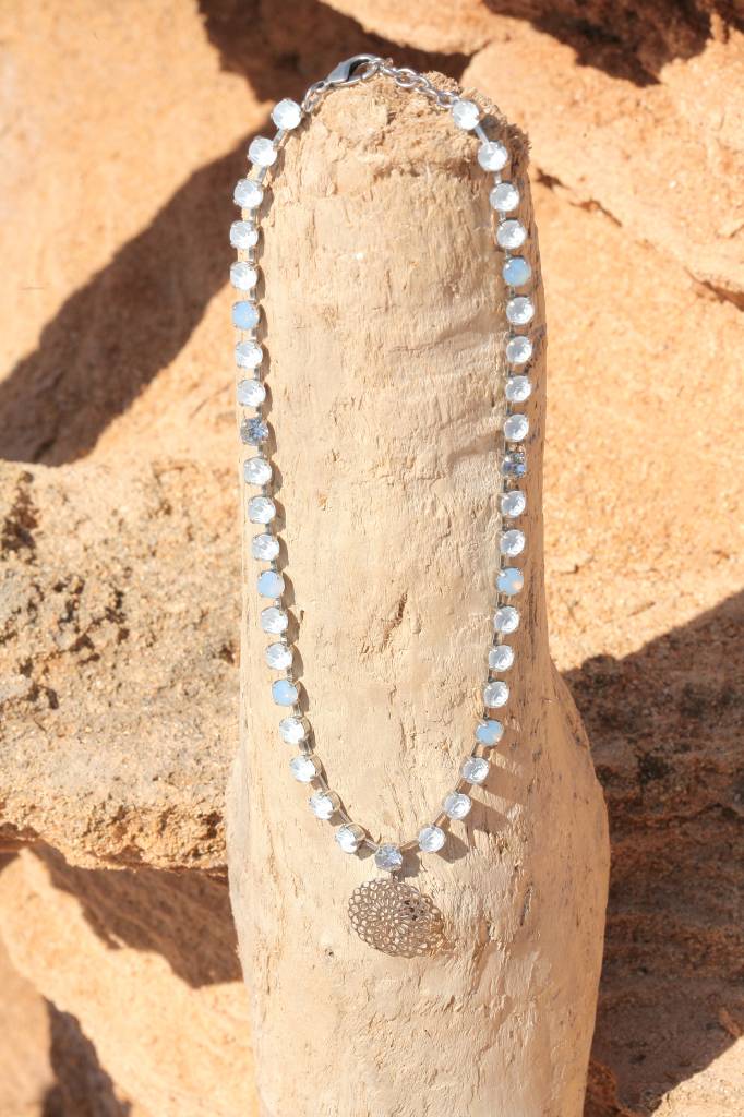 Dieses Collier hat eine sehr hochwertige Reinsilber Versilberung in einem einzigartigen Silber Patina Ton - Made in Germany! Die 6mm grossen Kristalle von SWAROVSKI sind puder hellblau mix.