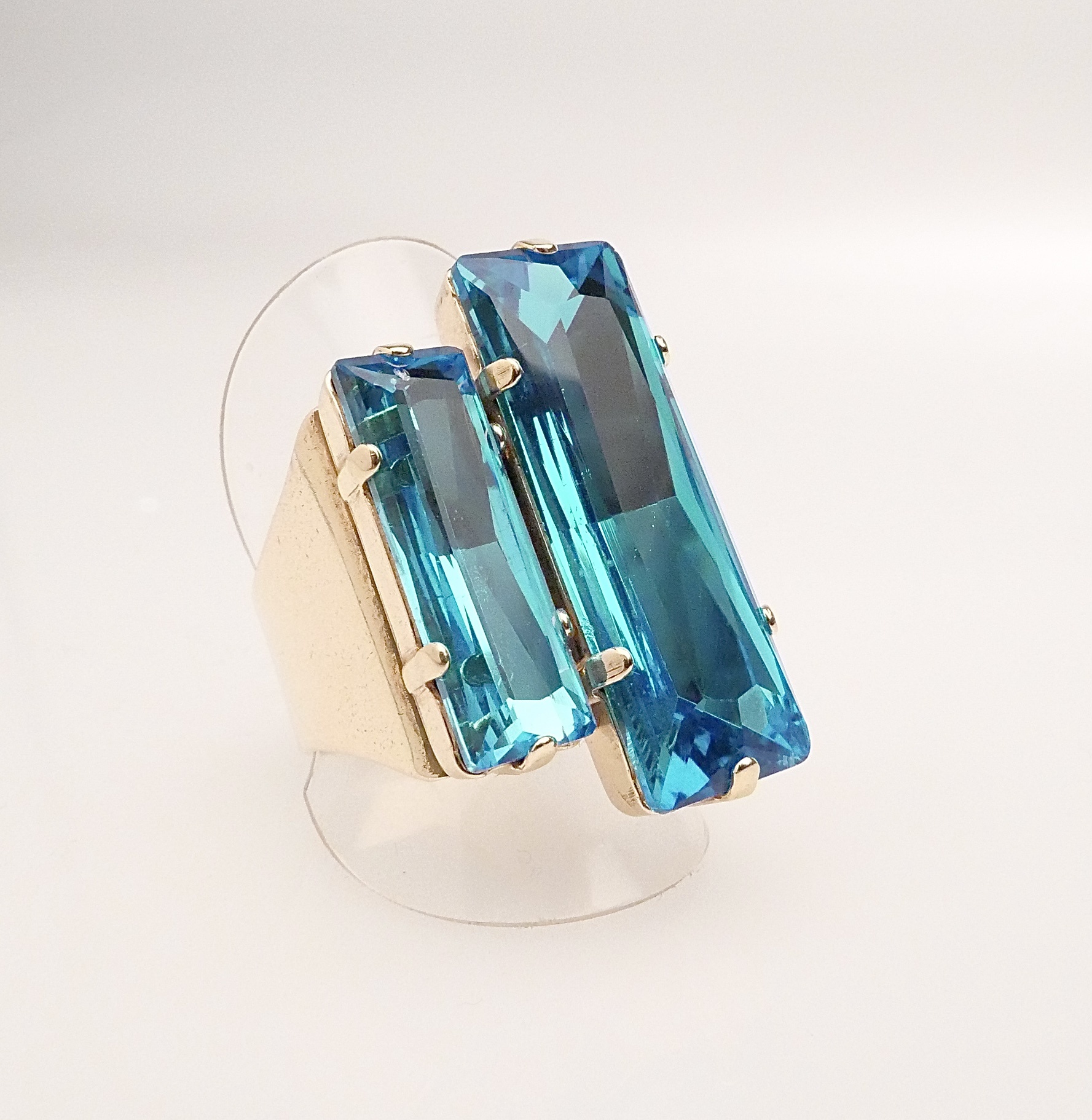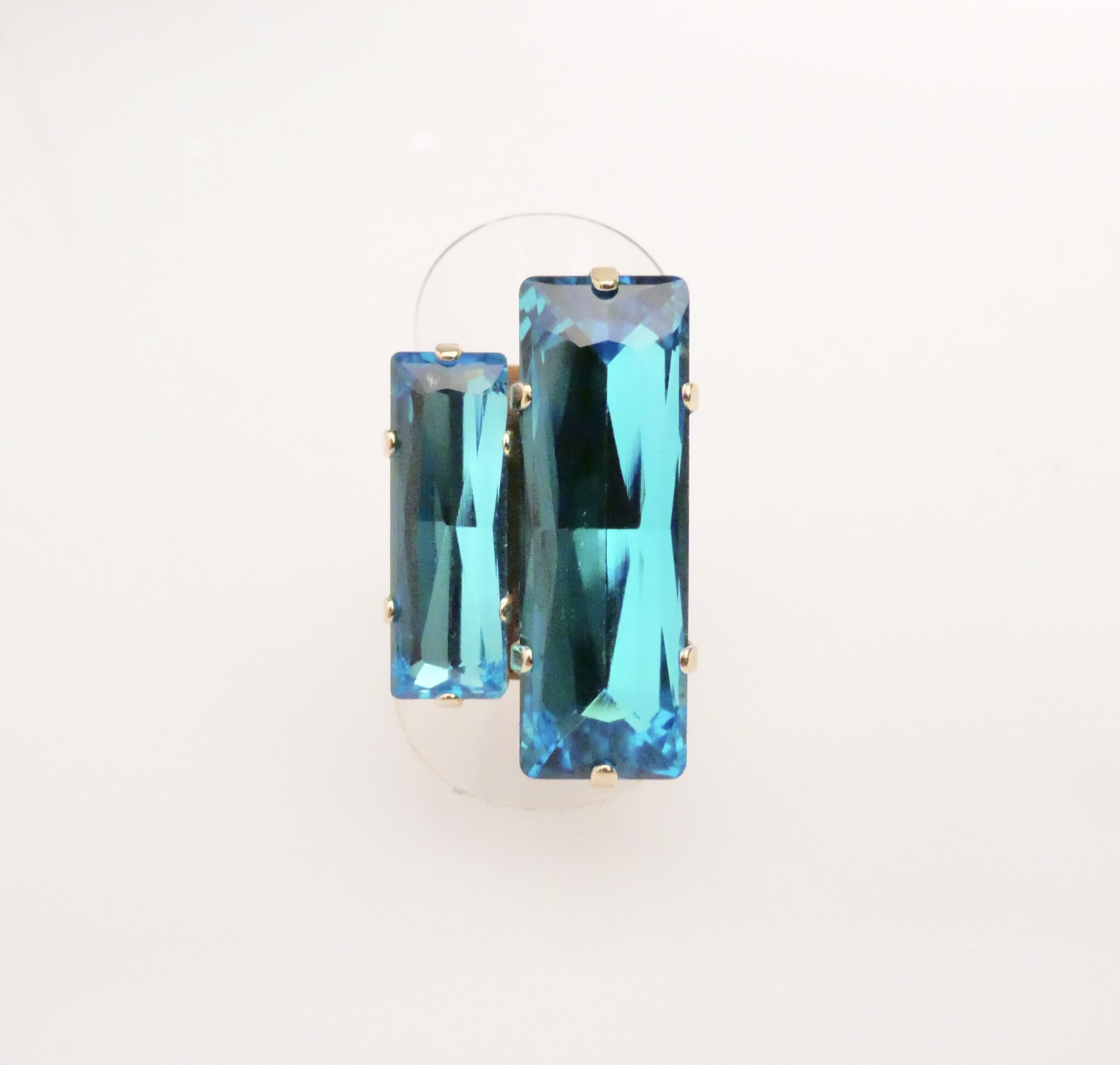 • Vergoldeter Baguette Ring mit 2 geschliffenen Kristallen in light Türkis.
