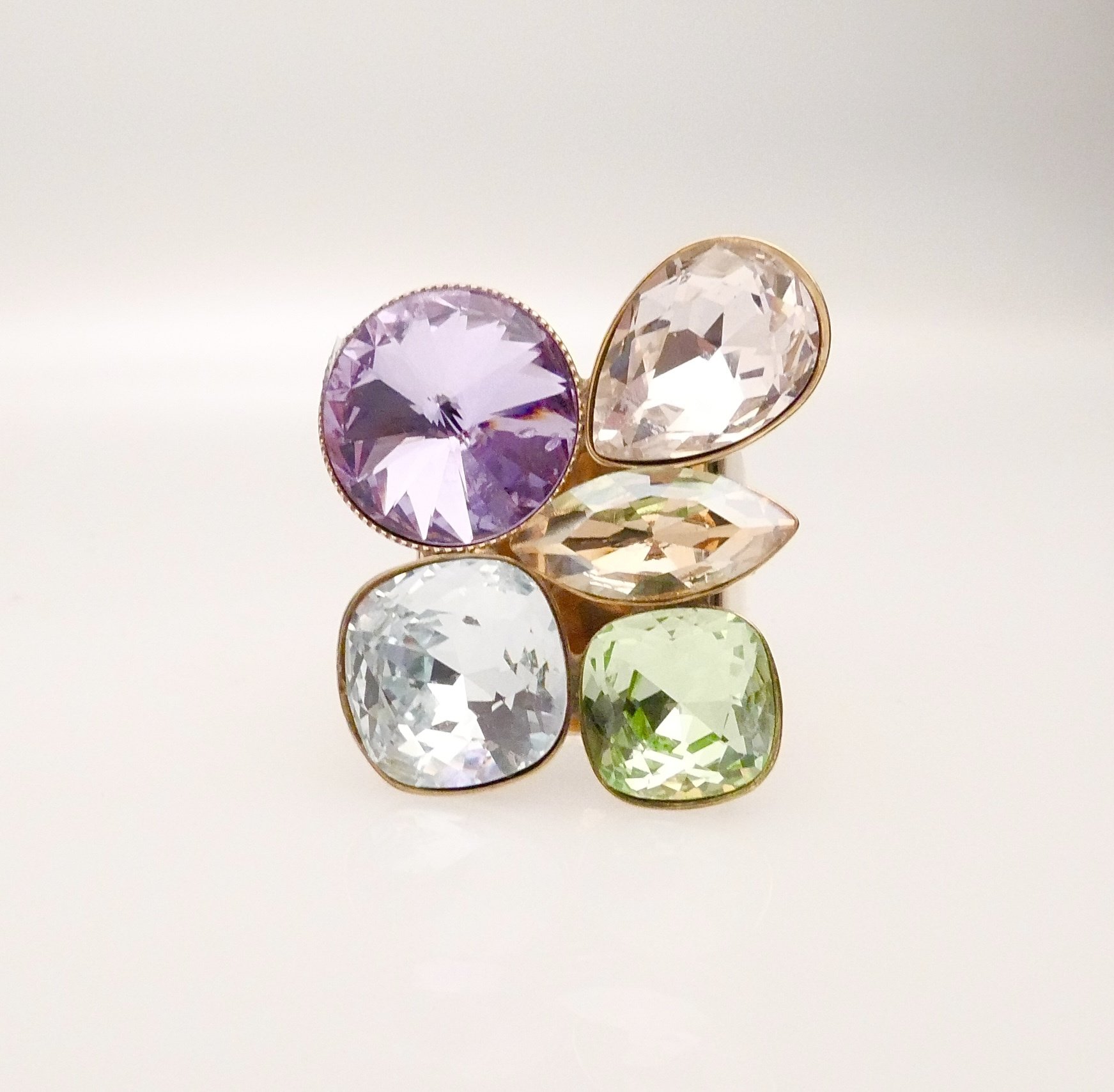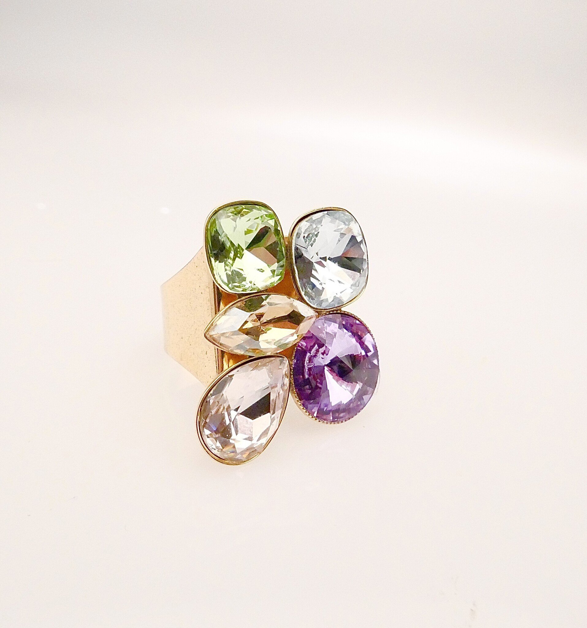 Goldener Ring mit 5 verschiedenen geschliffenen Kristallen. Der Ring hat eine hochwertige Vergoldung - Made in Germany. Die Ringgrösse ist verstellbar.