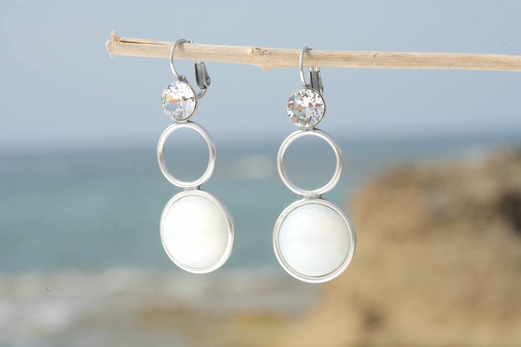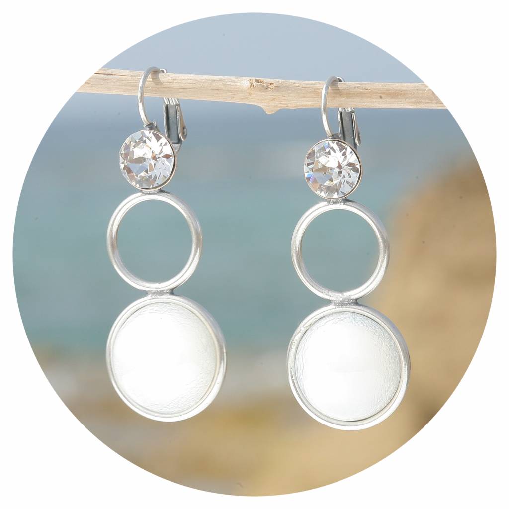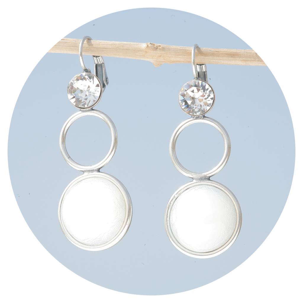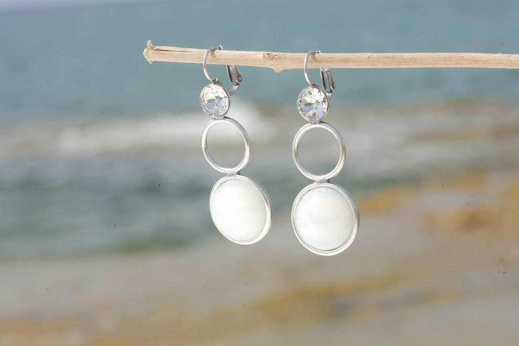 Diese Statement Ohrringe haben eine sehr hochwertige Reinsilber Versilberung in einem einzigartigen Silber Patina Ton - Made in Germany! Mit einem handgegossenen 16 mm grossen Glascabochon in white opal & einem geschliffenen Swarovski Kristall in cryst
