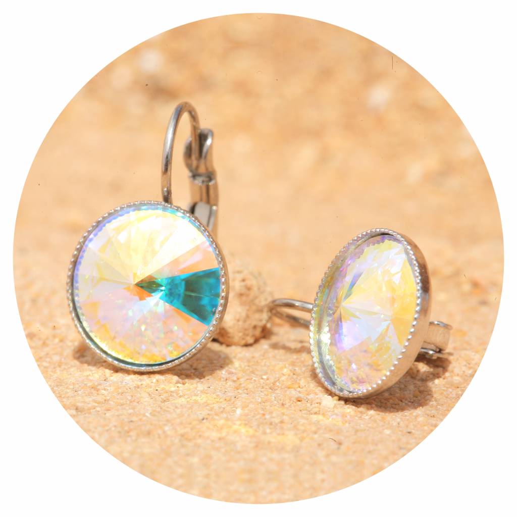 Ohrhänger mit Kristallen in einem Rivolischliff in der Farbe Crystal Aurora Borealis. Die Schmucksteine sind 12mm gross. Der Ohrring ist hochwertig rhodiniert - Made in Germany! Gerne fertigen wir Dir diesen Ohrring in deiner Wunschfarbe an!