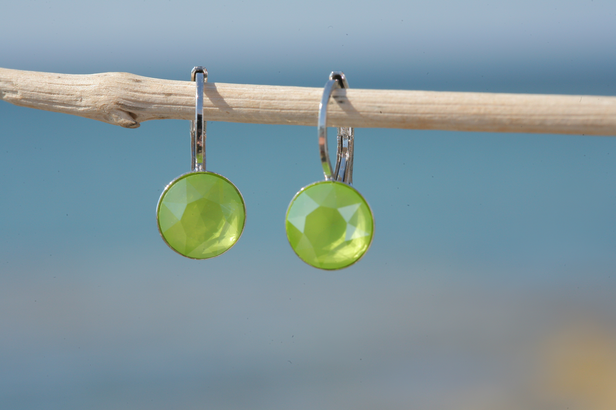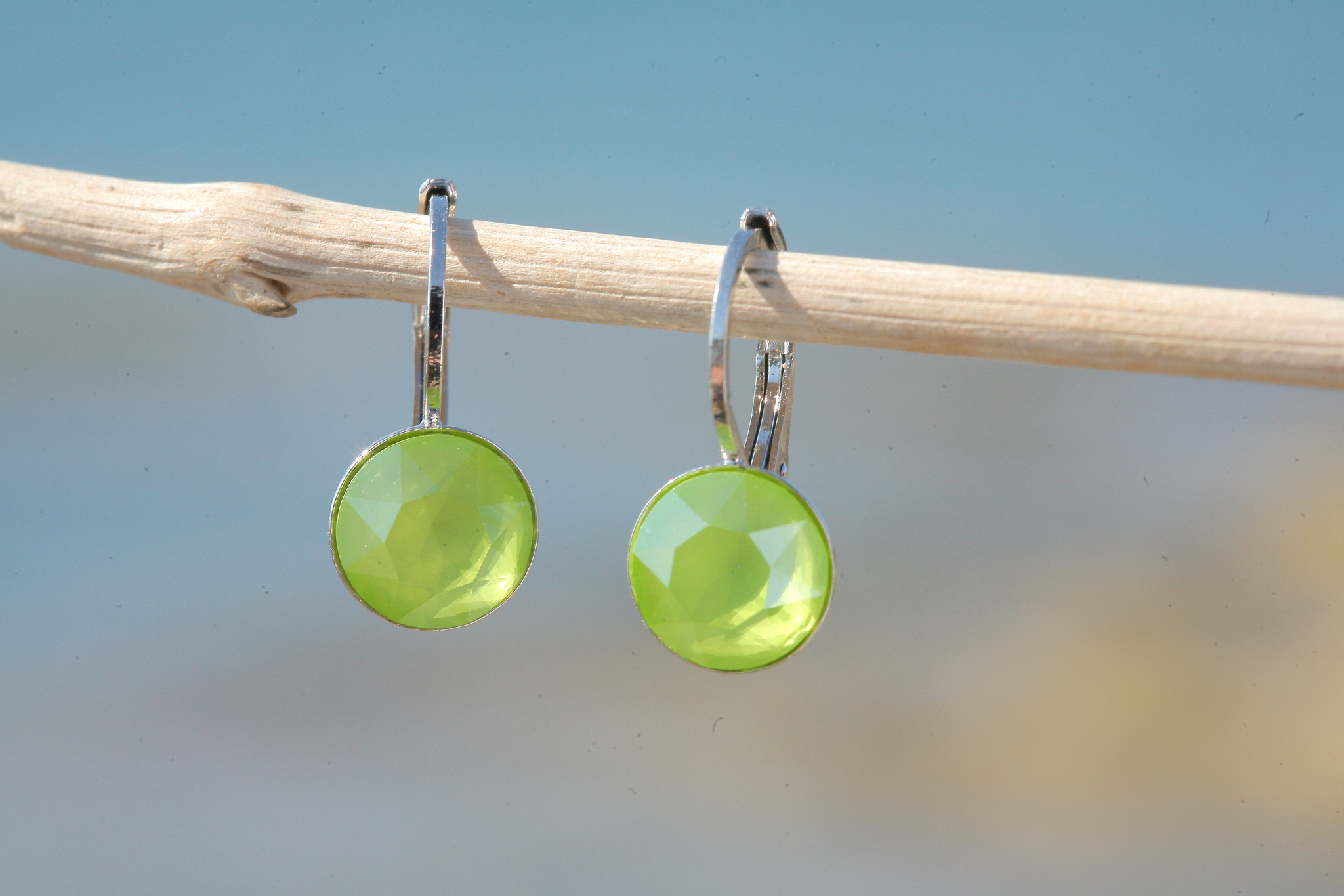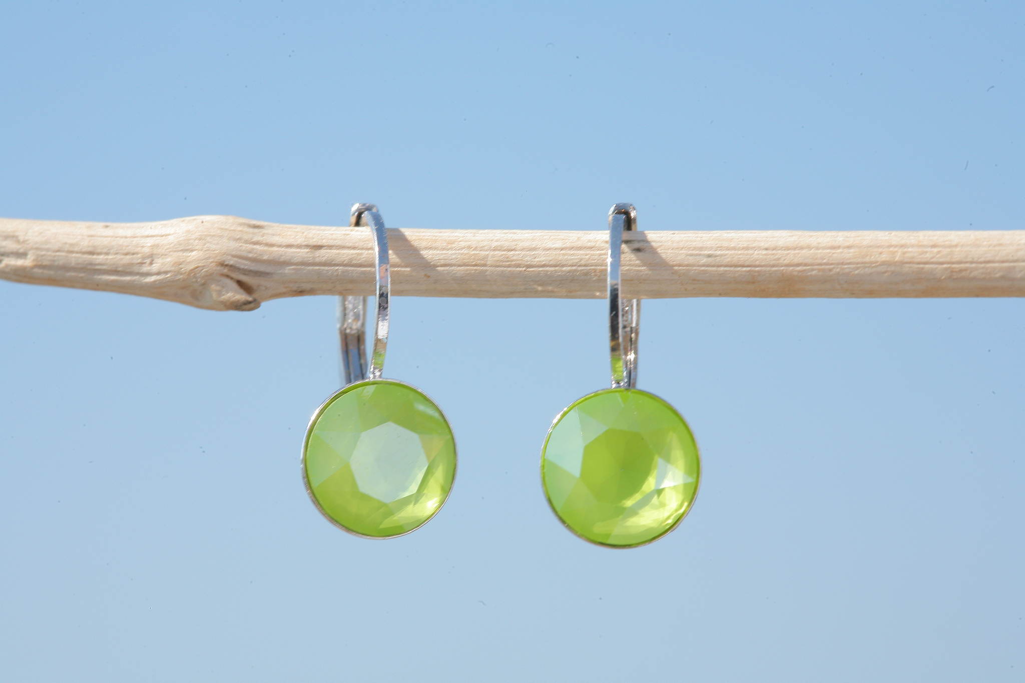 Stylische leichte Ohrringe mit 8mm grossen, geschliffenen Swarovski Kristallen in der Farbe lime. Unsere Ohrringe sind hochwertig rhodiniert - Made in Germany! Gerne fertigen wir Dir den Ohrring auch in deiner Wunschfarbe an!