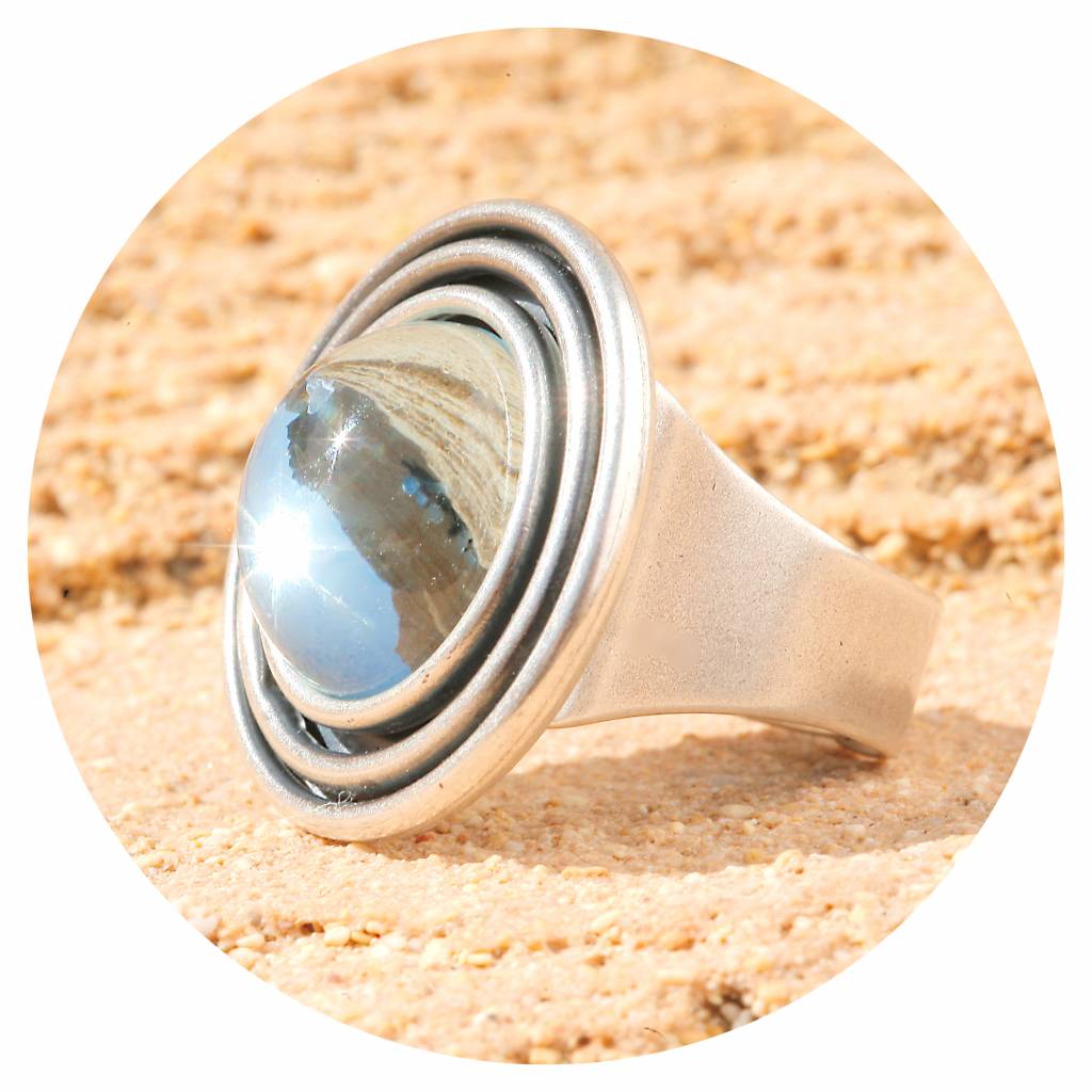 Dieser Ring hat eine sehr hochwertige Reinsilber Versilberung in einem einzigartigen Silber Patina Ton - made in Germany! Mit einem von Hand gegossenen 16mm grossen Glascabochon in azore blau.