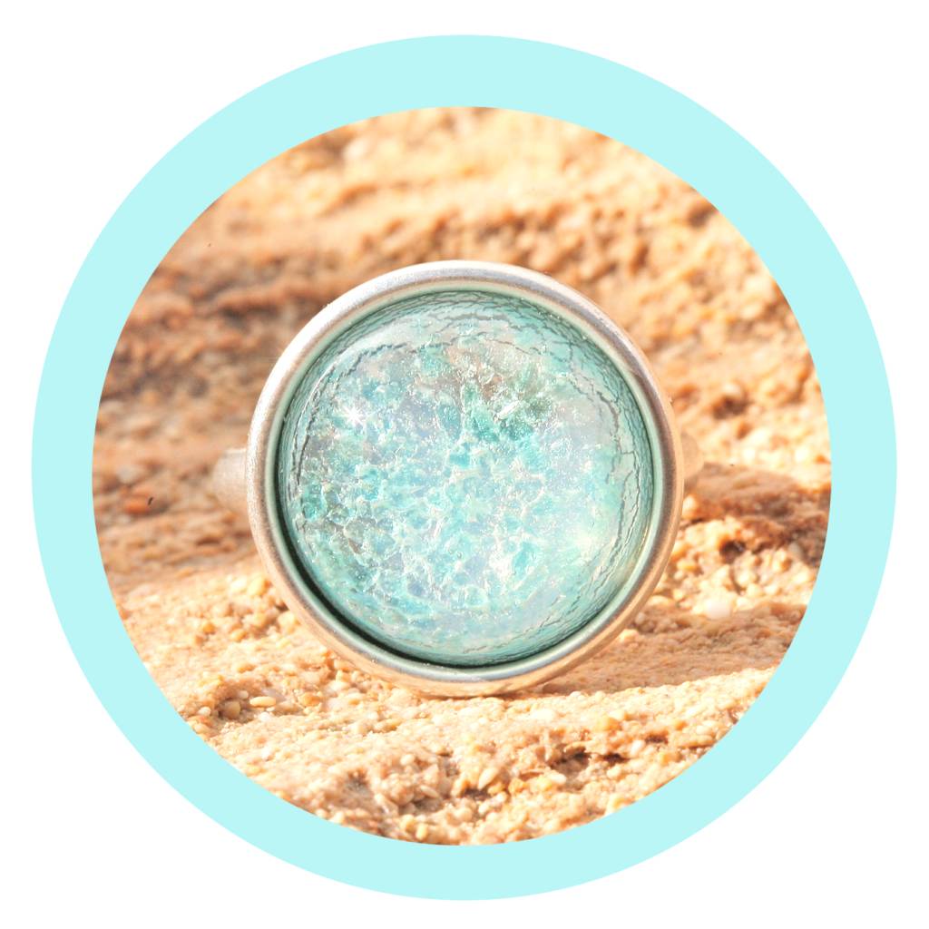 Dieser Ring hat eine sehr hochwertige Reinsilber Versilberung in einem einzigartigen Silber Patina Ton - made in Germany! Der von Hand gefertigte 16mm grosse Glascabochon ist ein mint patina mit eingeschmolzenem Feinsilber.