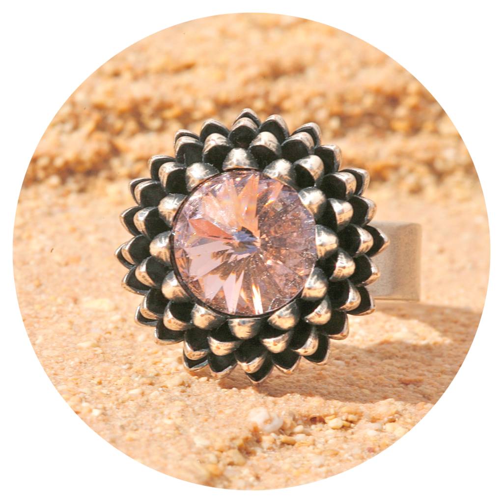 Dieser Ring hat eine sehr hochwertige Reinsilber Versilberung in einem einzigartigen Silber Patina Ton - made in Germany! Der geschliffene Kristall in vintage rose ist ein Kristall von SWAROVSKI und 10 mm gross . Die schwere abstrakte Ananasform hat eine