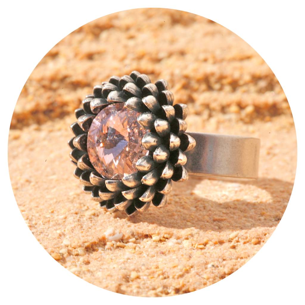 Dieser Ring hat eine sehr hochwertige Reinsilber Versilberung in einem einzigartigen Silber Patina Ton - made in Germany! Der geschliffene Kristall in vintage rose ist ein Kristal von SWAROVSKI und 10 mm gross . Die schwere abstrakte Ananasform hat einen Durchmesser von 16mm. Die Ringschiene ist in der Grösse verstellbar von 52-61. Diesen Ring können wir Dir in vielen Farben anfertigen. Hand made in unserem eigenem Atelier in Düsseldorf!