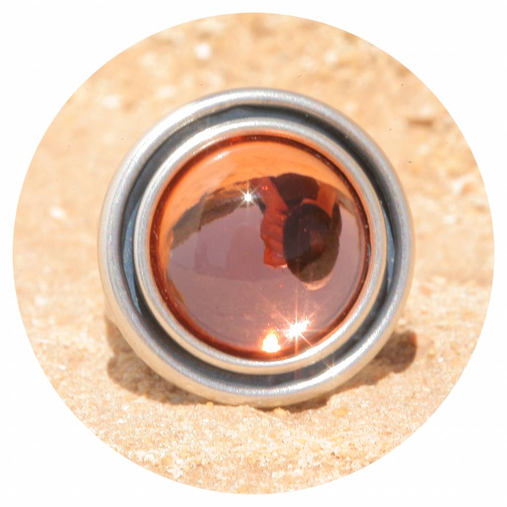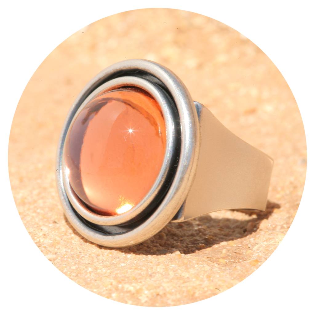 Dieser Ring hat eine sehr hochwertige Reinsilber Versilberung in einem einzigartigen Silber Patina Ton - Made in Germany! Der von Hand gefertigte 16mm grosse Glascabochon ist rose peach farben.