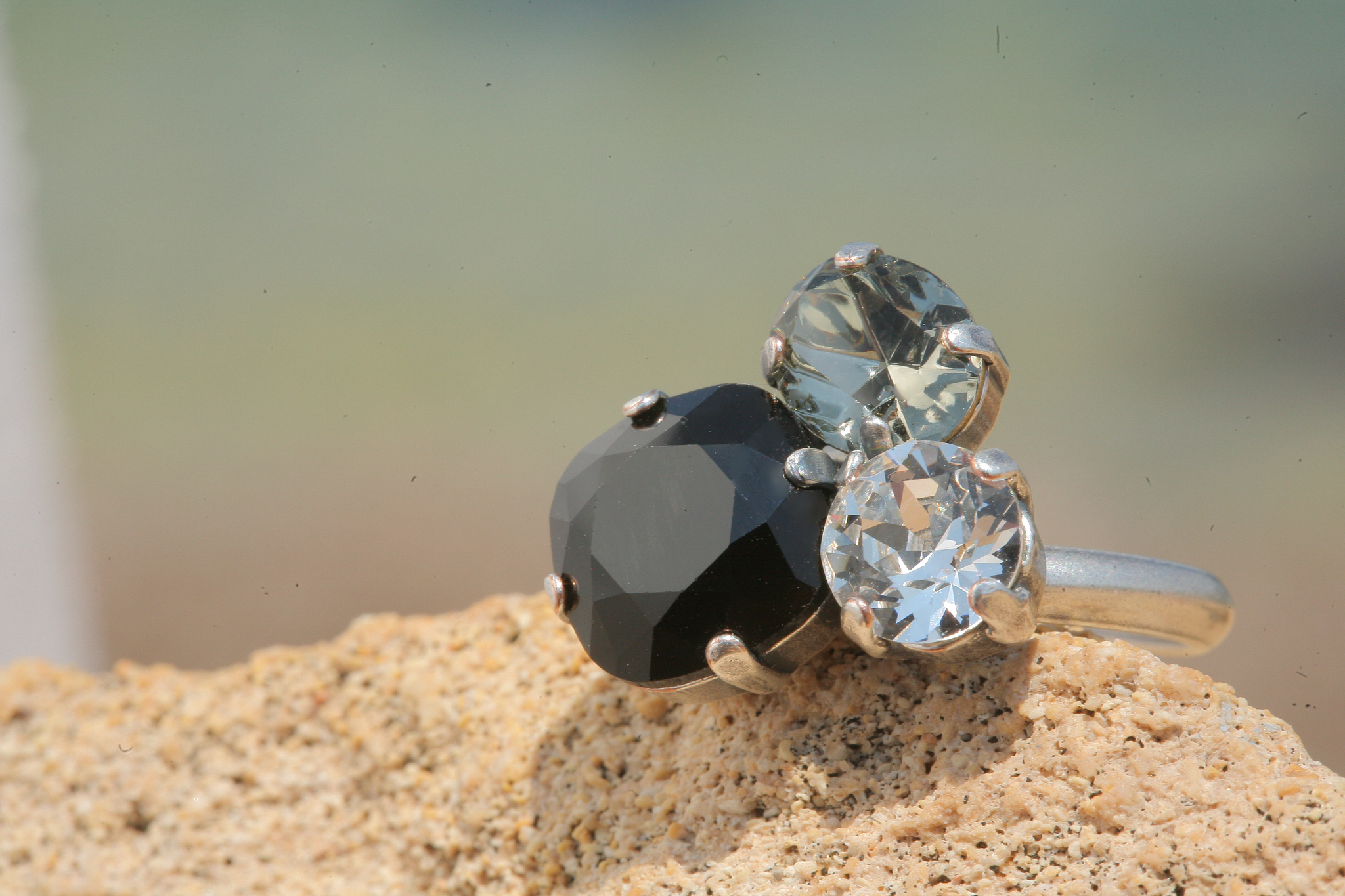 Dieser Ring hat eine sehr hochwertige Reinsilber Versilberung in einem einzigartigen Silber Patina Farbton - Made in Germany! Mit 3 geschliffenen Kristallen von Swarovski - einen 8mm grossen runden crystal Kristall, ein ovaler Black diamond Kristall 8 x10 mm gross und ein 12 mm grosser quadratischer Kristall mit einem cushion cut in der Farbe Jet. Die Gesamtgrösse ist ca. 2,3 x 2 cm. Die Ringschiene ist in der Größe verstellbar von ca. 46-62. Diesen Ring können wir Dir sehr gerne auch in vielen anderen Farbkombinationen anfertigen. Hand made in unserem Atelier in Düsseldorf!