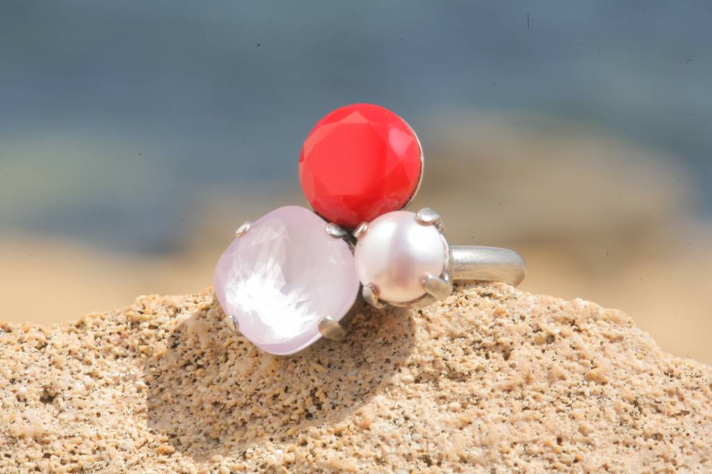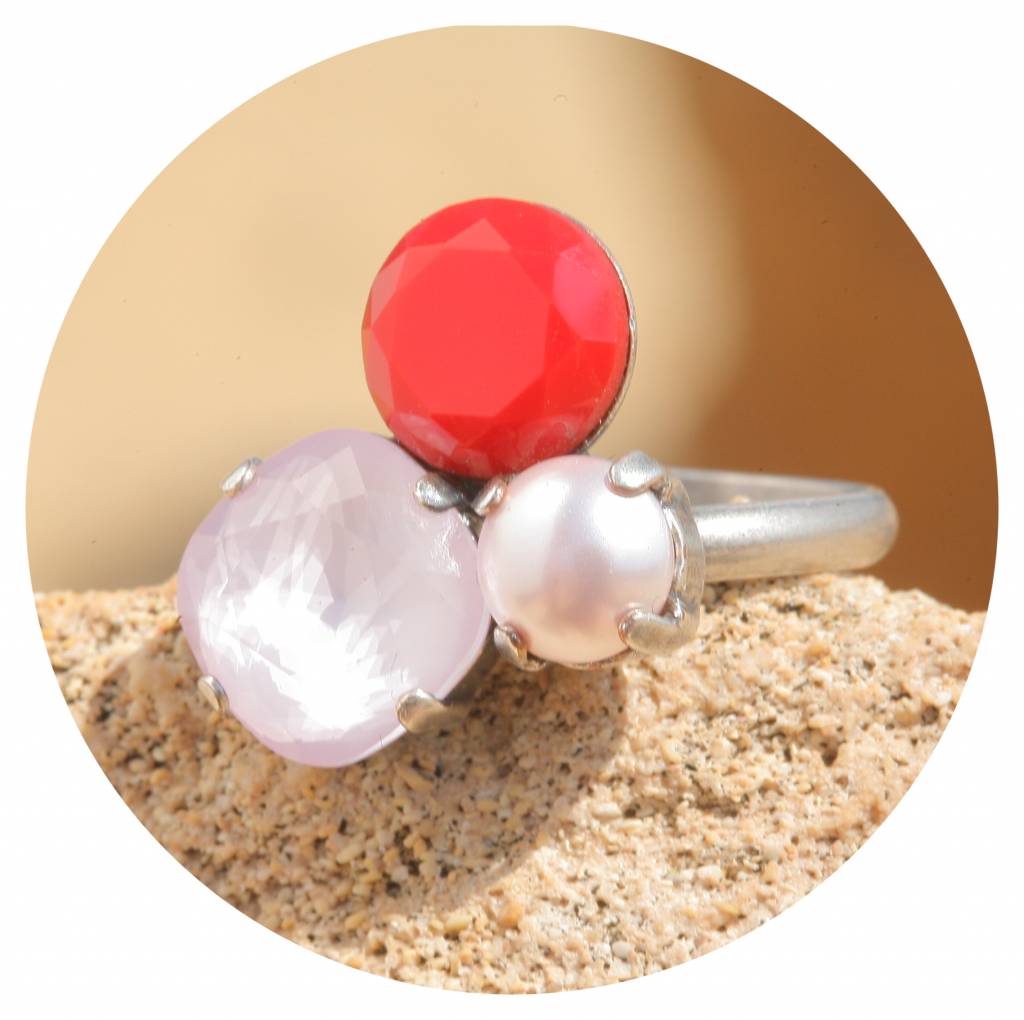 Dieser Ring hat eine sehr hochwertige Reinsilber Versilberung in einem einzigartigen Silber Patina Farbton - Made in Germany! Mit 2 geschliffenen Kristallen - einer runden 8mm grossen Halbperle in rose pearl, ein Kristall 10mm gross in coral red & ein powder rose Kristall 12 x 12 mm gross mit einem cushion cut. Die Gesamtgrösse des Rings ist ca. 2,3 x 2 cm. Die Ringschiene ist in der Grösse verstellbar von 46-62. Diesen Ring können wir Dir in vielen Farbkombinationen anfertigen. Hand made in unserem Atelier in Düsseldorf!