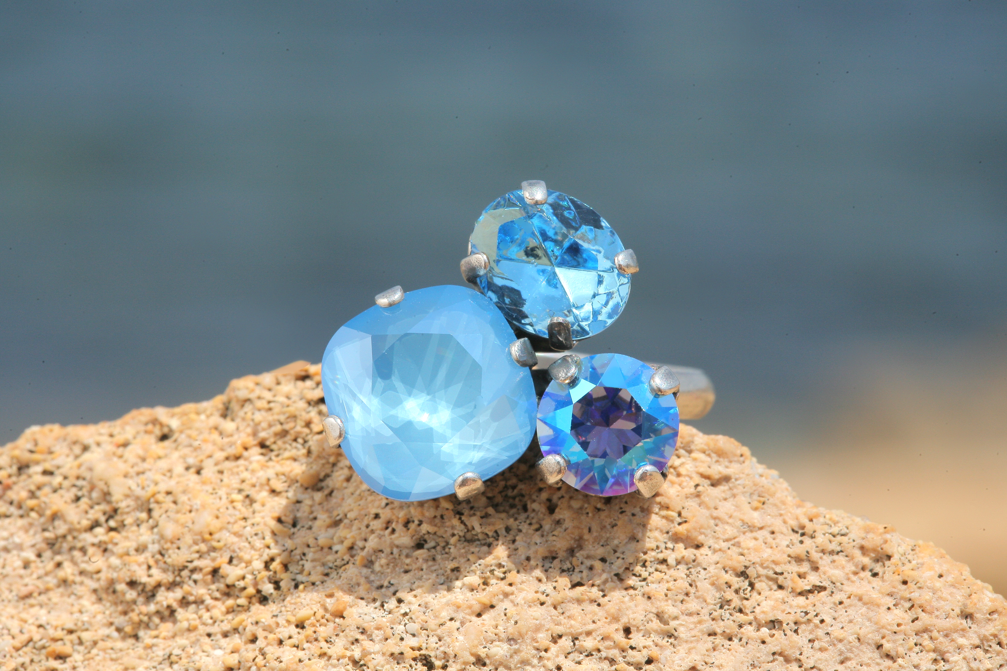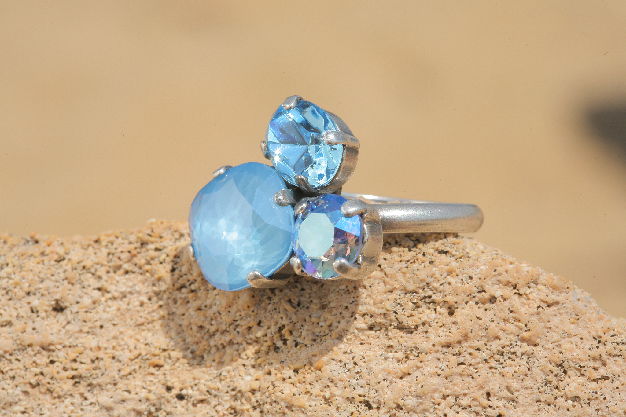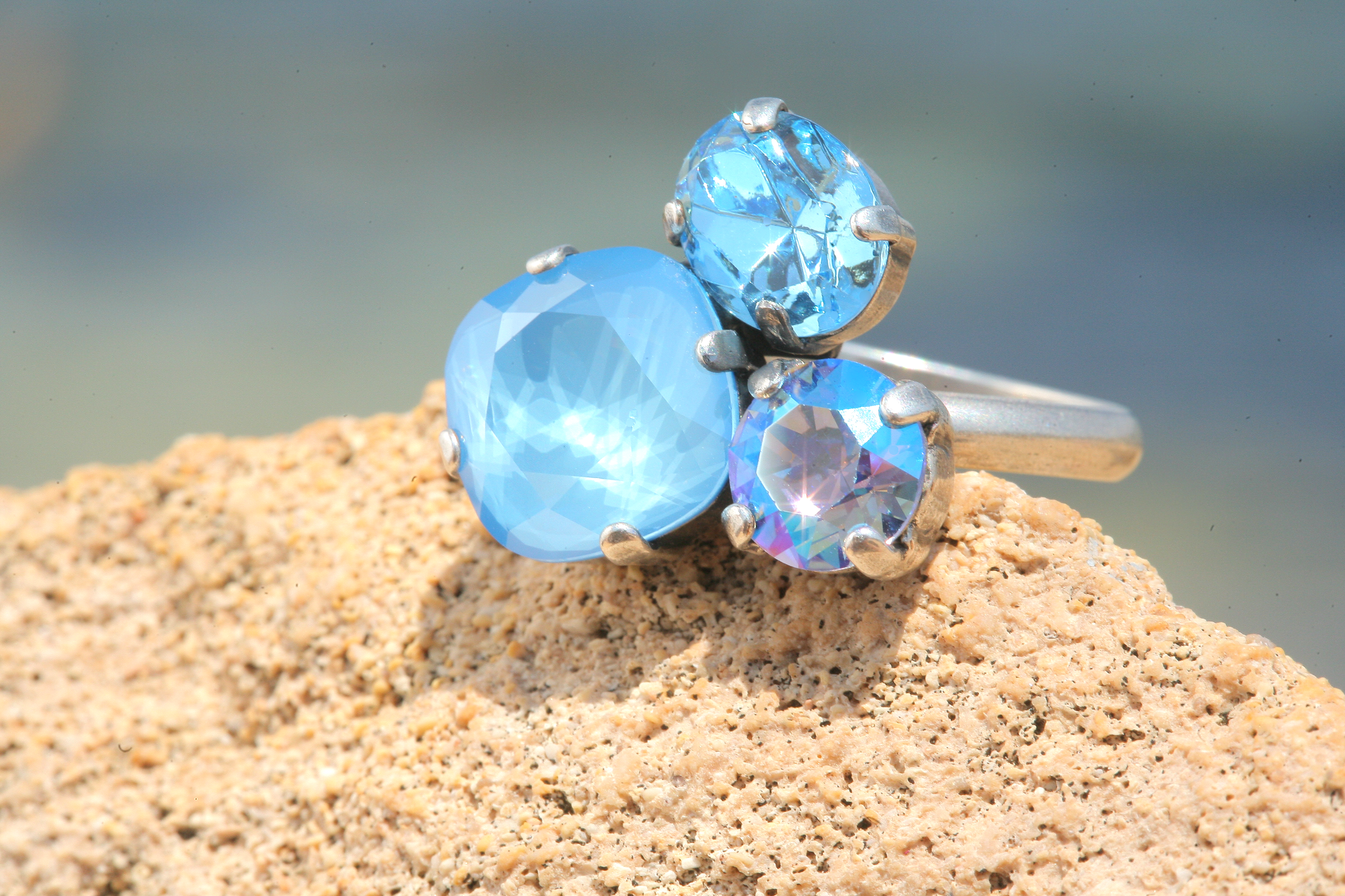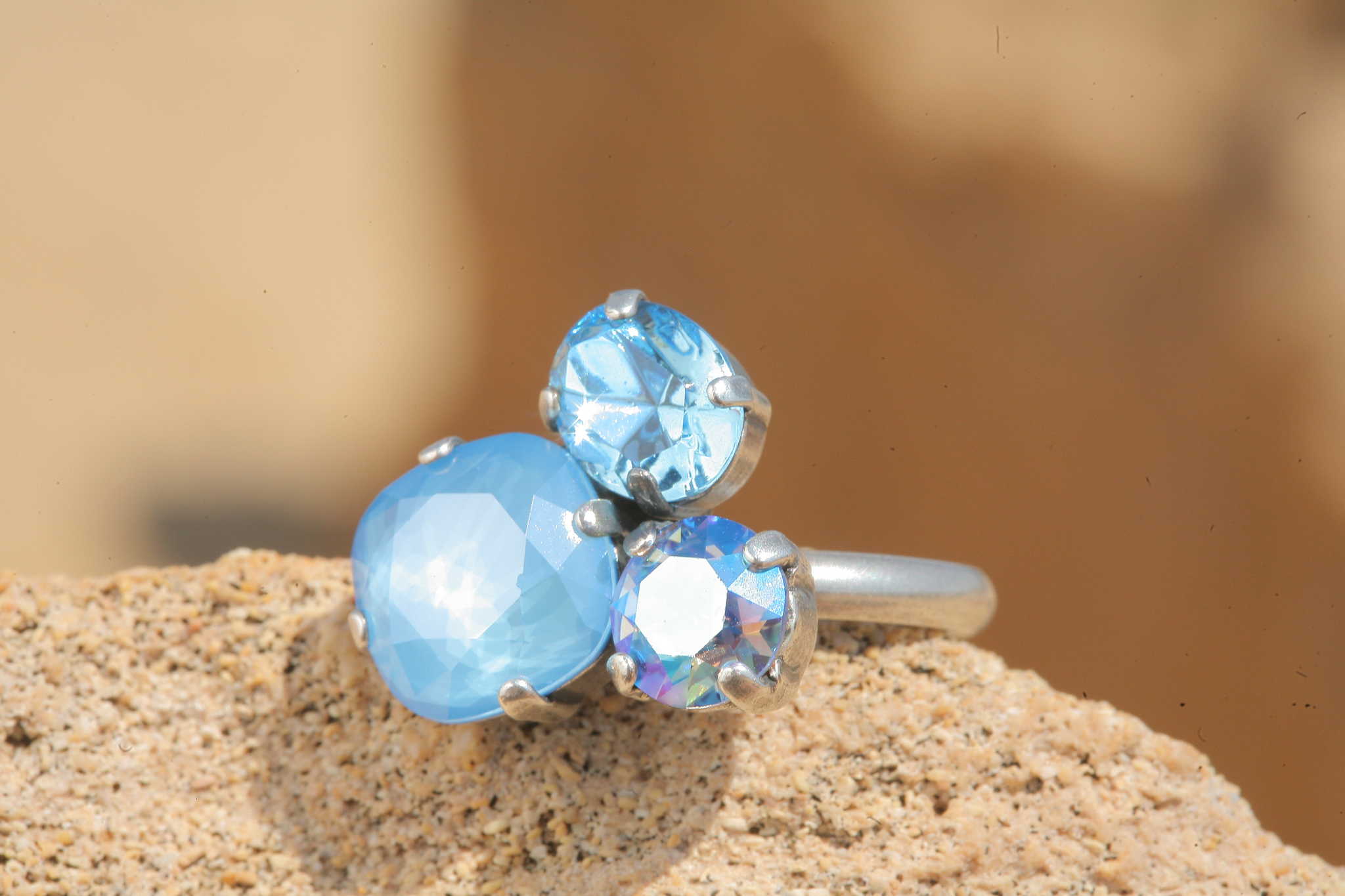 Dieser Ring hat eine sehr hochwertige Reinsilber Versilberung in einem einzigartigen Silber Patina Farbton - Made in Germany! Mit 3 geschliffenen Kristallen von Swarovski - einen 8mm grossen runden sapphire glitter Kristall, ein ovaler Aquamarine Kristall 8 x10 mm gross und ein 12 mm grosser quadratischer Kristall mit einem cushion cut in der Farbe summer blue. Die Gesamtgrösse ist ca. 2,3 x 2 cm. Die Ringschiene ist in der Größe verstellbar von ca. 46-62. Diesen Ring können wir Dir sehr gerne auch in vielen anderen Farbkombinationen anfertigen. Hand made in unserem Atelier in Düsseldorf!