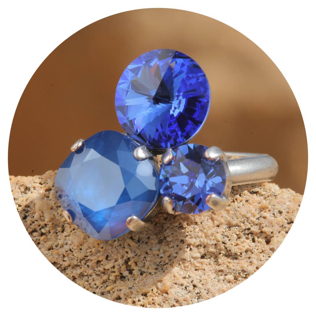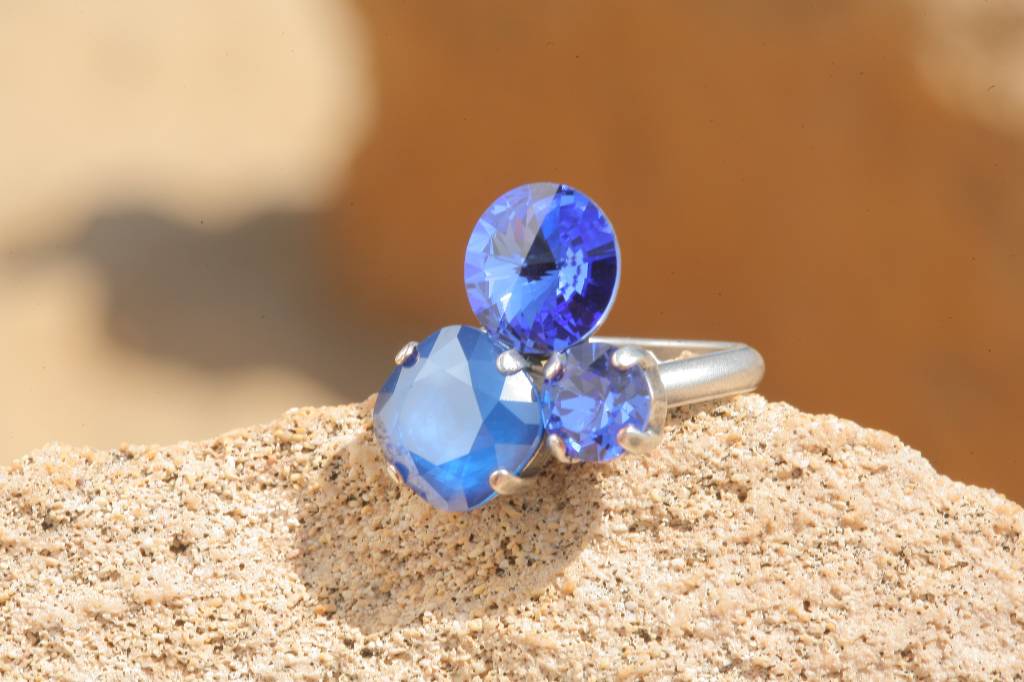 Dieser Ring hat eine sehr hochwertige Reinsilber Versilberung in einem einzigartigen Silber Patina Farbton - Made in Germany! Mit 3 geschliffenen Kristallen von Swarovski - einem runden 8mm grossen Kristall in sapphire blue, ein Kristall mit einem Rivolieschliff 10mm gross in sapphire blue & ein royal blue Kristall 12 x 12 mm gross in einem cushion cut. Die Gesamtgrösse des Rings ist ca. 2,3 x 2 cm. Die Ringschiene ist in der Grösse verstellbar von 46-62. Diesen Ring können wir Dir in vielen Farbkombinationen anfertigen. Hand made in unserem Atelier in Düsseldorf!