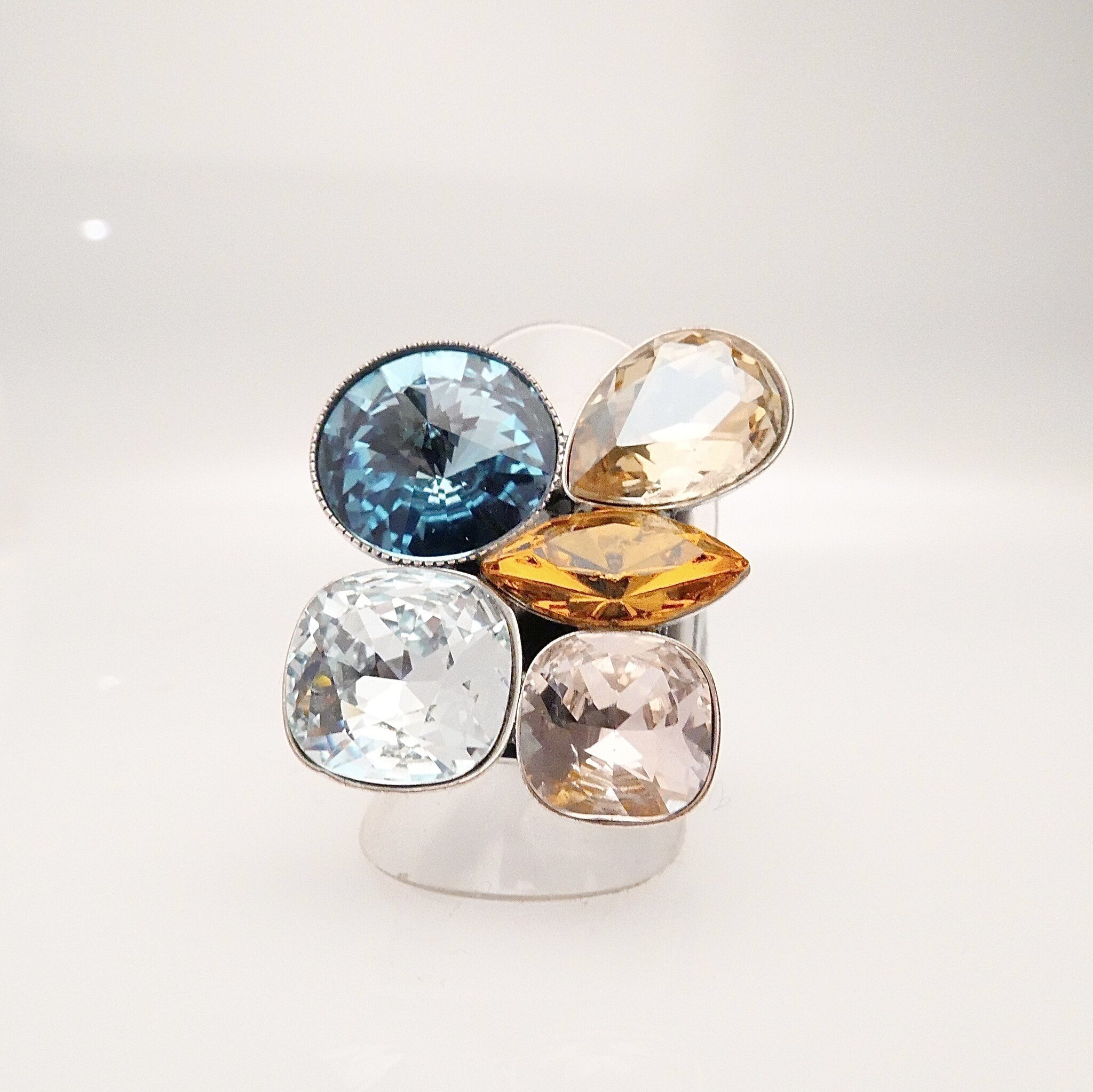 Silberner Ring mit 5 verschiedenen geschliffenen Kristallen. Der Ring hat eine hochwertige Silberauflage in einem besonderen Silber Patina Ton - Made in Germany. Die Ringgrösse ist verstellbar.